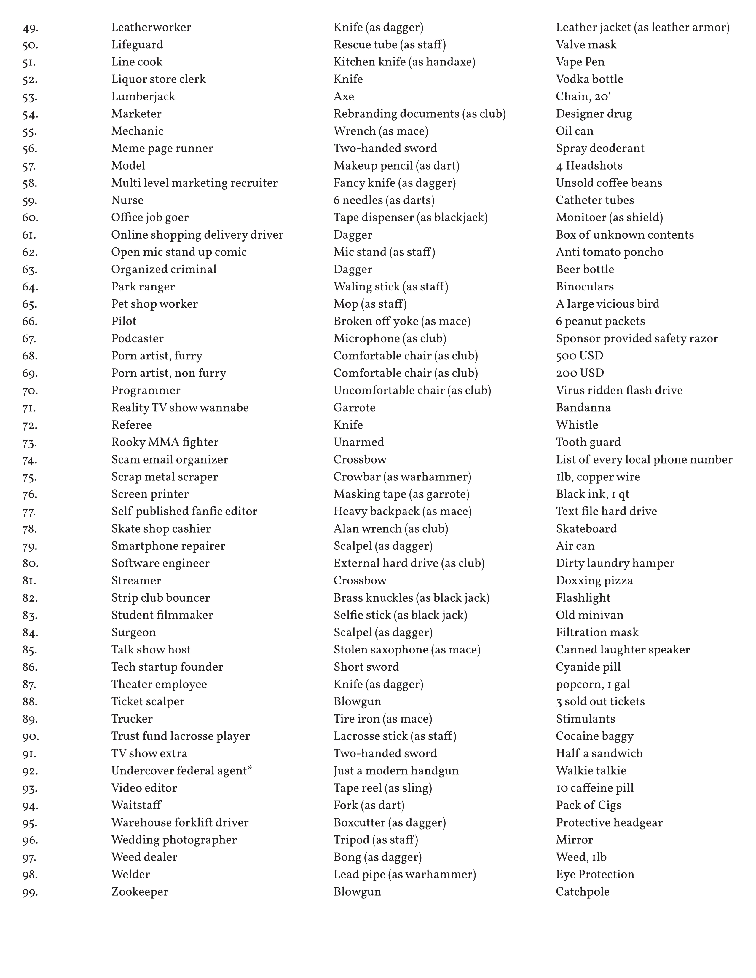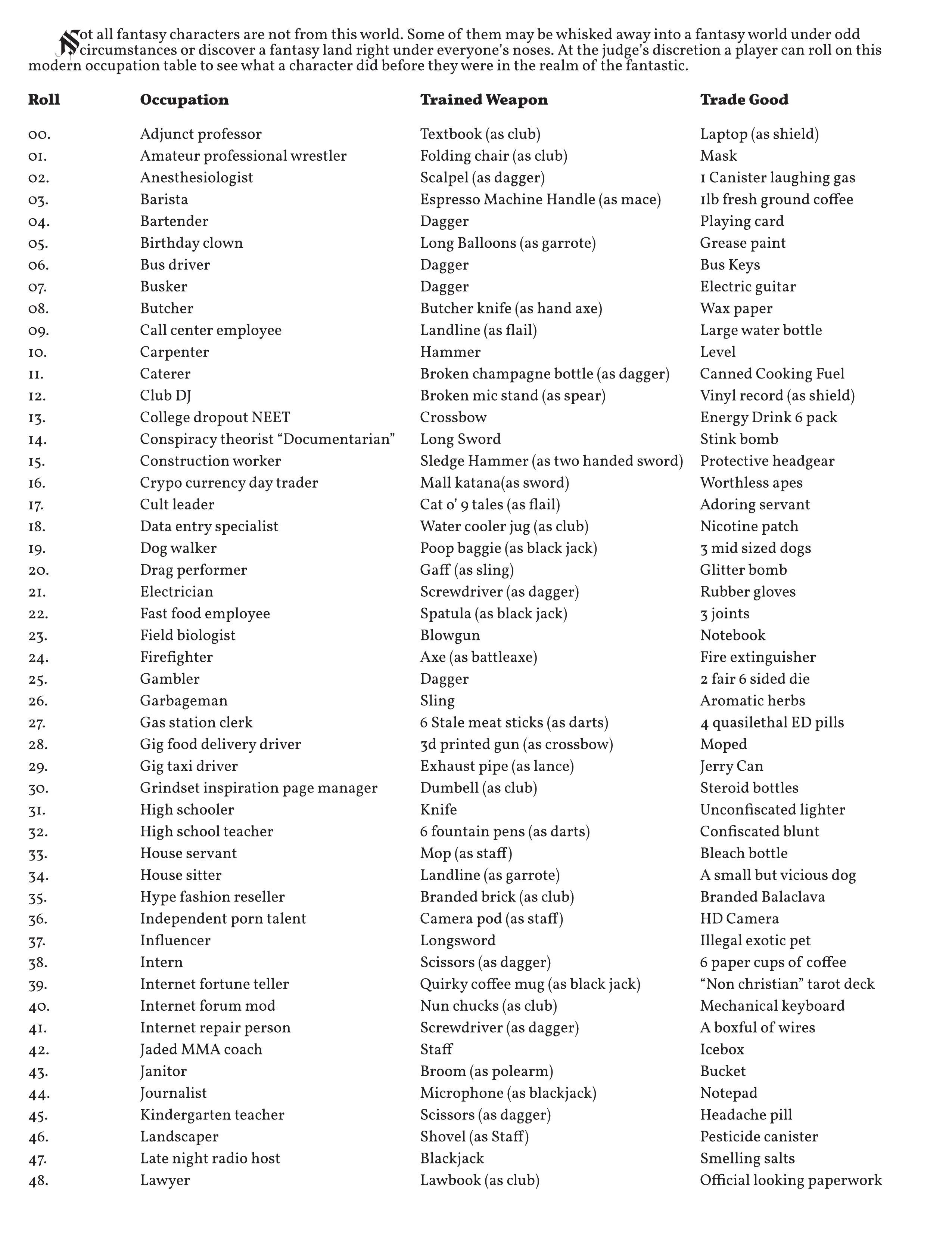 I love magic masquerade style fantasy. As such I made this in case I ever want to run such a game in DCC. However this is totally inapplicable for games where the sent to another dimension or the like, this will result in immediate death of anyone involved in the game.