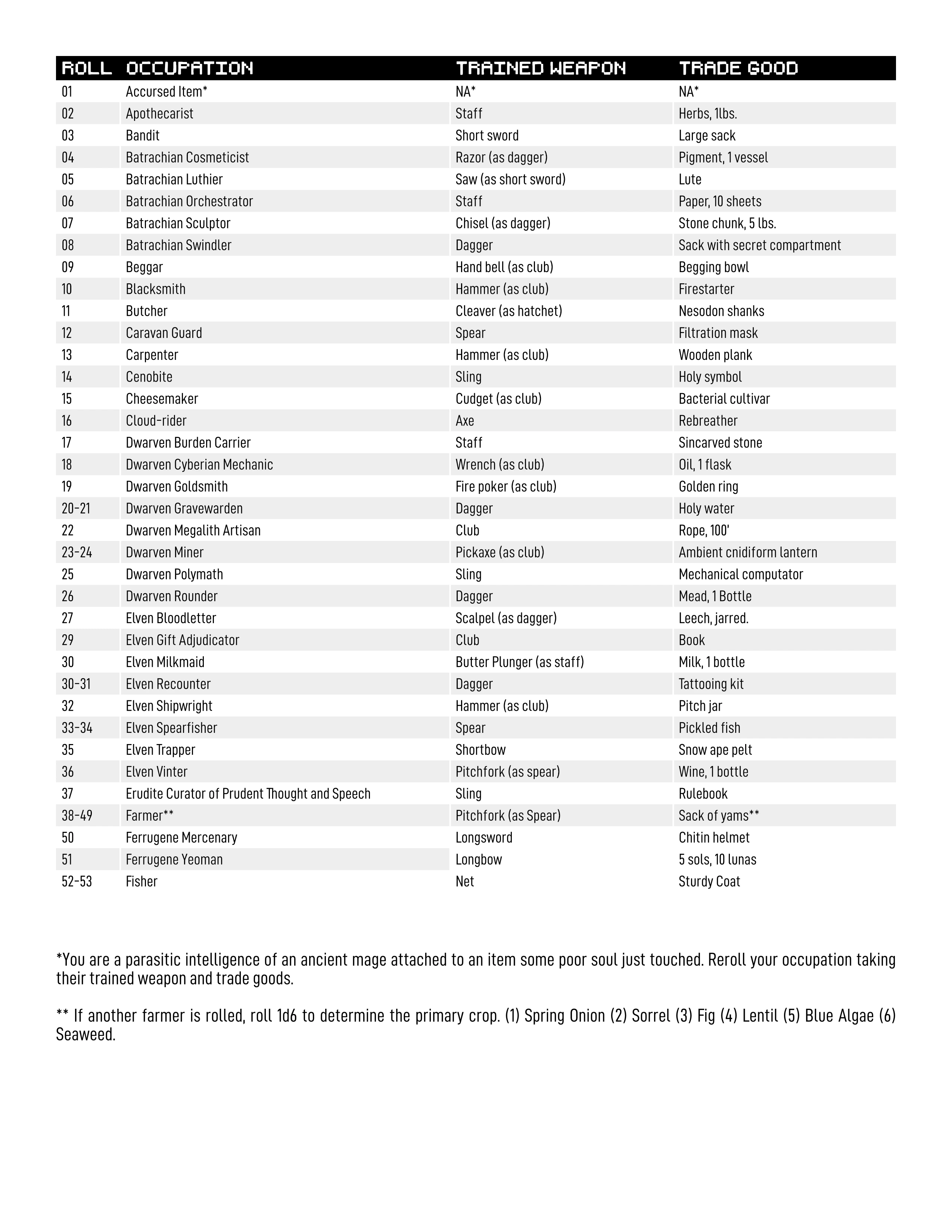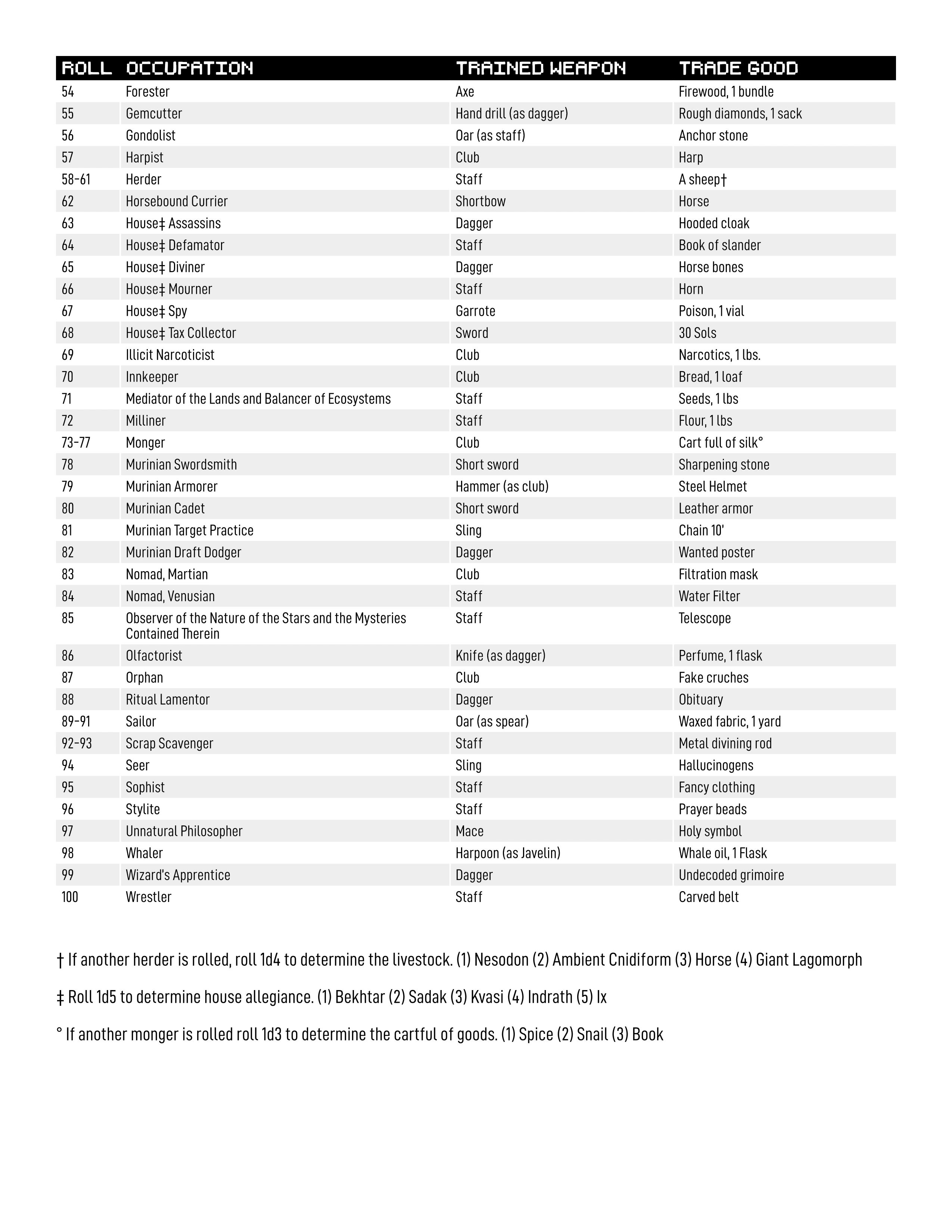 I got interested in Antibor after seeing the mask relay entry for Yngta Pé. As such I am soon to be starting a Zurth game very soon. I made this occupation table for making a bunch of level zeros in Zurth and surrounding areas. Hopefully I will not have people permanently back out like what happened with the ave nox game I was gonna start not too long ago.